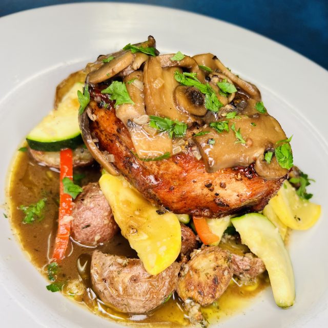 Pork tenderloin served over garlic roasted red potatoes & sauteed vegetables. Finished with a bourbon mushroom sauce.